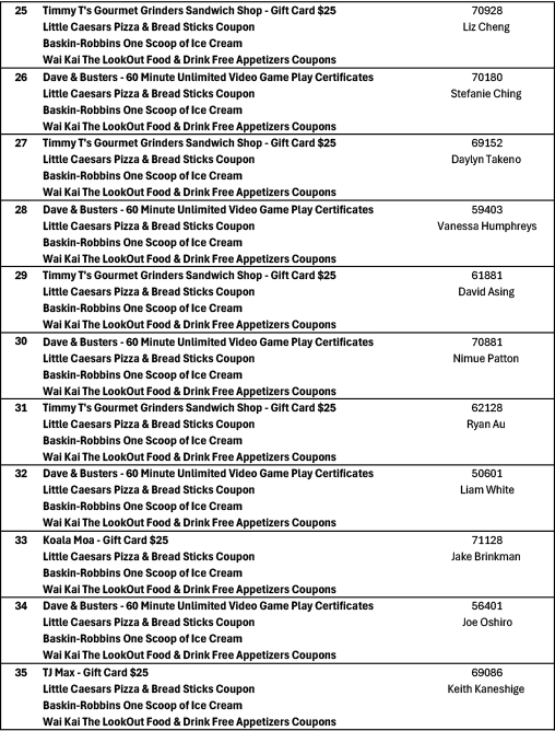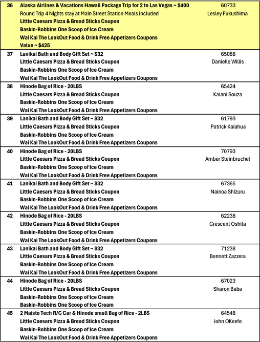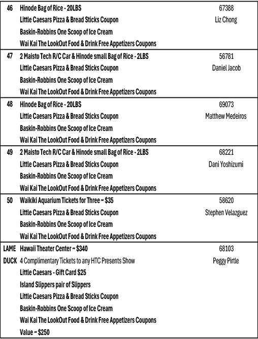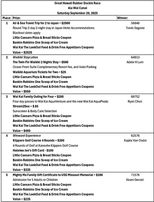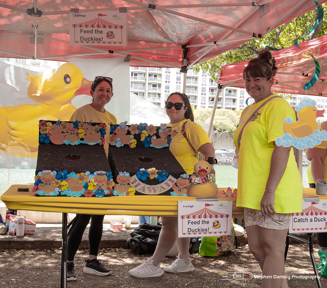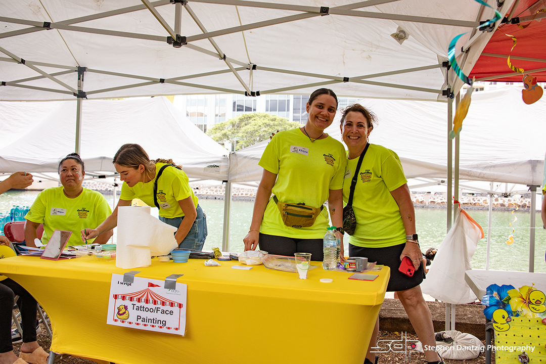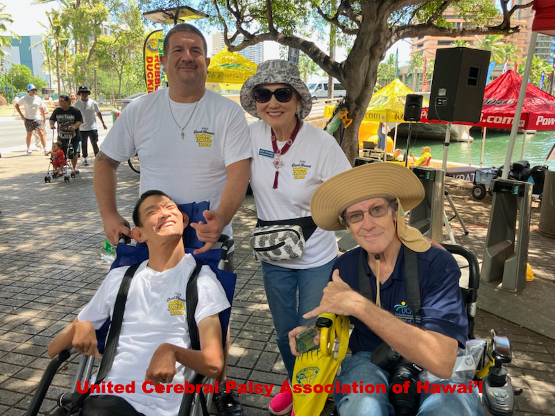 What a great day! The morning looked ominous with dark clouds over the event area. However, the day turned out to be beautiful, even after short “Hawaiian Blessing” sprinkles early in the event. The day started with a showcase of some truly beautiful and creative motorcycles at the McCully Shopping Center (Mahalo McCully!) The main tents and events were along the promenade by the Hawaiian Convention Center by the bridge where 20,000 rubber duckies would be dropped into the Ala Wai Canal. The promenade was full of people and keiiki (children) playing duckie games by noon (unfortunately, I don’t have parents permission to post the photos of the keiki, but, like our keiki play dates, I am not sure who was having more fun–the kids, or the volunteers! There was a special race for our incredible sponsors before the Ala Wai turned yellow with duckies. Congratulations all of our prize winners (see list below). Please head down to our office (@ 420 Waiakamilo Road, Suite 105, Honolulu, HI 96817) to collect your prize. Mahalo for your support and for an amazing Rubber Duckie Race. It was so great to be back at a duckie race after missing a few years. The support, caring and LOVE that was evident all day was truly touching. I am posting this on Monday, so it is “Amazing Monday!” We usually post about a person who is famous and achieved amazing heights with a disability. Today’s Amazing Monday is dedicated to ALL OF YOU. We all face something everyday, whether it is visible, like cerebral palsy, or more personal. YOU ARE AMAZING! Special mahalos go out to our amazing sponsors and everyone who contributed to our duckie race—your support helped a little kid continue his or her own AMAZING LIFE! MAHALO! Please enjoy the photos of the event, but first, a very special mahalo to our sponsors; there would be no duckie race without them! The event images are after the list of prize winners.