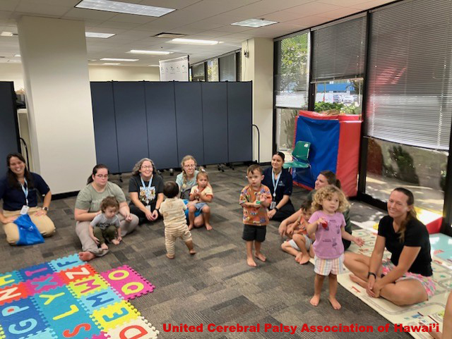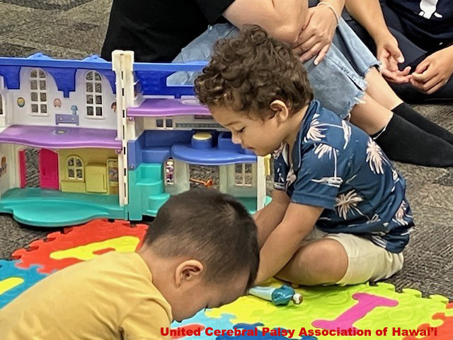 United Cerebral Palsy Association of Hawai’i Keiki Play Date: where play meets learning! [Alt text: Four images of children playing with adult supervision]